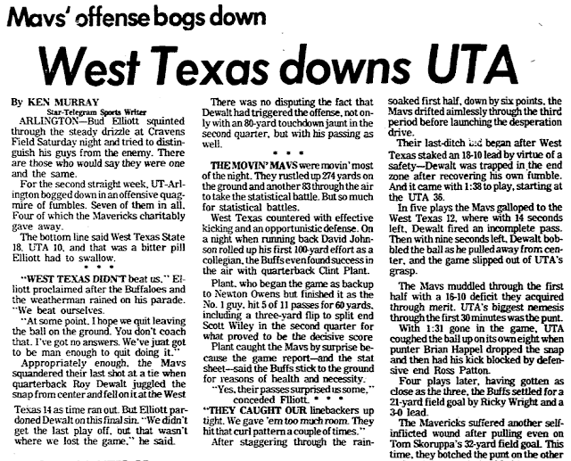I find that odd because he was a winning coach before coming to Arlington, going 64-27-11 in ten seasons as a coach for several NAIA teams in Kansas. He received some type of coach of the year four times in that span. I've not seen even box scores from those times, but it is hard to have success with an excessive number of turnovers and penalties. In ten years of coaching the Mavs, he had a similar body of work almost every season. I chronicled many of the missteps in this post. Unfortunately, that carries over into today's game. Spoiler alert, today's game is in the misstep post.